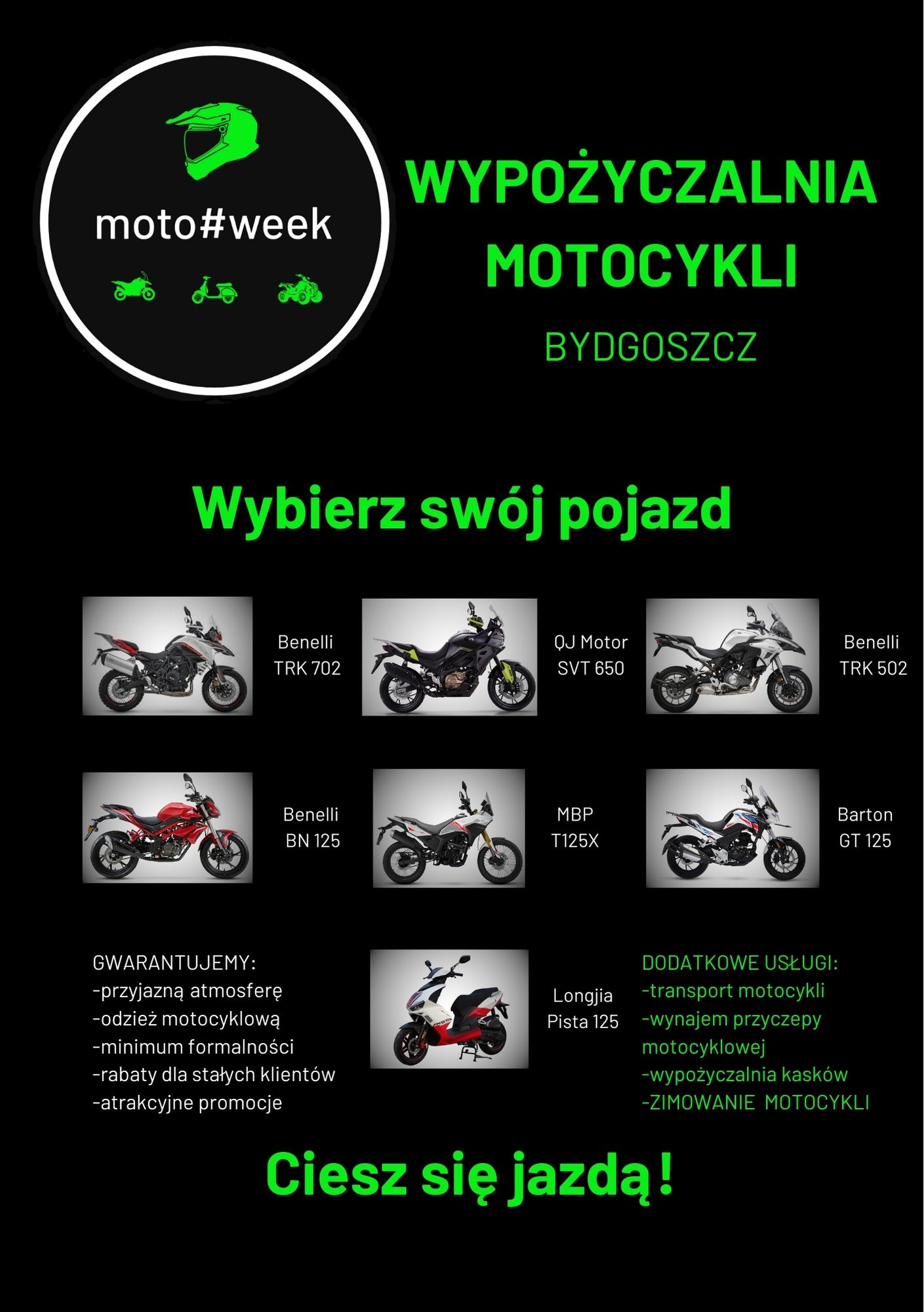 MOTO#WEEK to wypożyczalnia motocykli i skuterów z Bydgoszczy, oferująca zróżnicowaną flotę pojazdów dostosowaną do potrzeb zarówno doświadczonych motocyklistów, jak i osób rozpoczynających swoją przygodę na dwóch kołach. Firma zapewnia elastyczne warunki wynajmu, w tym możliwość wypożyczenia motocykli turystycznych wyposażonych w kufry, apteczki oraz zestawy naprawcze do opon. Dodatkowo, MOTO#WEEK oferuje wynajem przyczep motocyklowych, kasków oraz usługę zimowania motocykli.